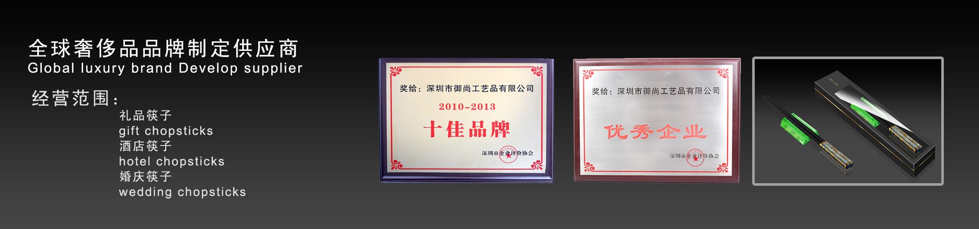 御尚健康產(chǎn)業(yè)(深圳)有限公司旗下御尚工藝筷子榮獲深圳市企業(yè)評(píng)價(jià)協(xié)會(huì)授予的2013年度“優(yōu)秀企業(yè)”和年度“十佳品牌獎(jiǎng)”稱號(hào)。 深圳市御尚工藝品前身為深圳市御尚工藝筷子廠,是御尚健康產(chǎn)業(yè)(深圳)有限公司和香港御尚實(shí)業(yè)有限公司全資子公司,是一家專業(yè)從事高檔筷子及紅木工藝品設(shè)計(jì),研發(fā)和銷售及生產(chǎn)為一體的專業(yè)供應(yīng)商,位...【更多詳情】 |
